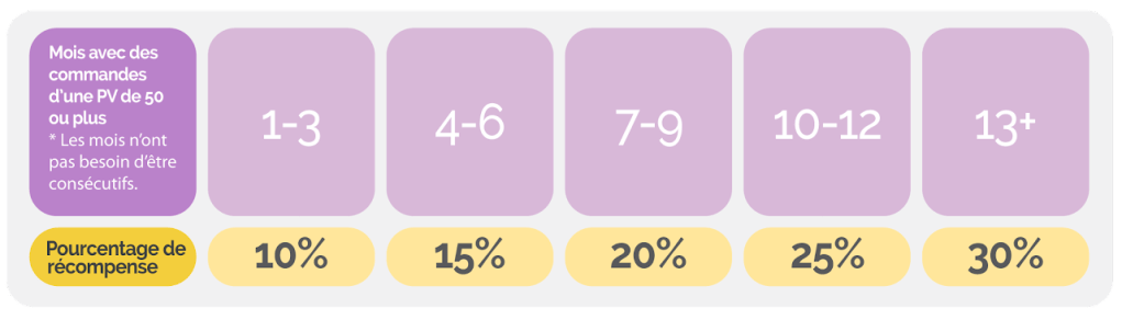 Il vous permet de choisir les produits que vous souhaitez recevoir au moment désiré, tout en vous récompensant de maintenir un mode de vie sain! Chaque produit est associé à une valeur (PV).